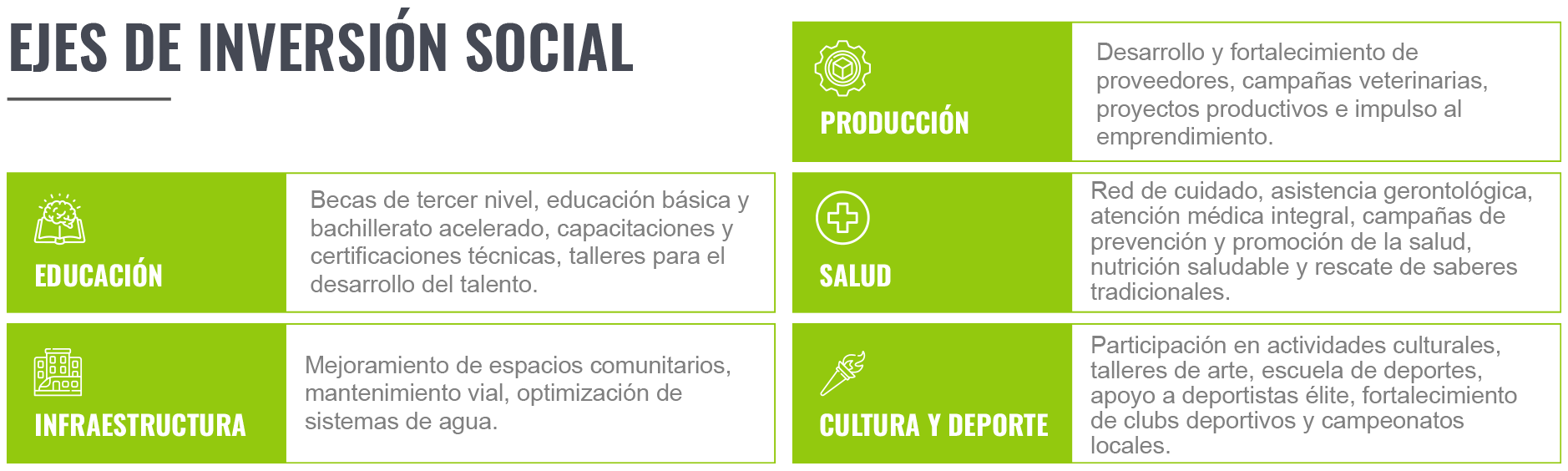 - Proyecto Educativo Comunitario: Financia estudios y capacitación para comunidades cercanas al Proyecto Loma Larga, apoyando carreras técnicas universitarias mediante un convenio con el American College Institute, estudios básicos y bachillerato acelerado con FUNDER, y talleres técnicos en panadería, belleza, cocina y hotelería.