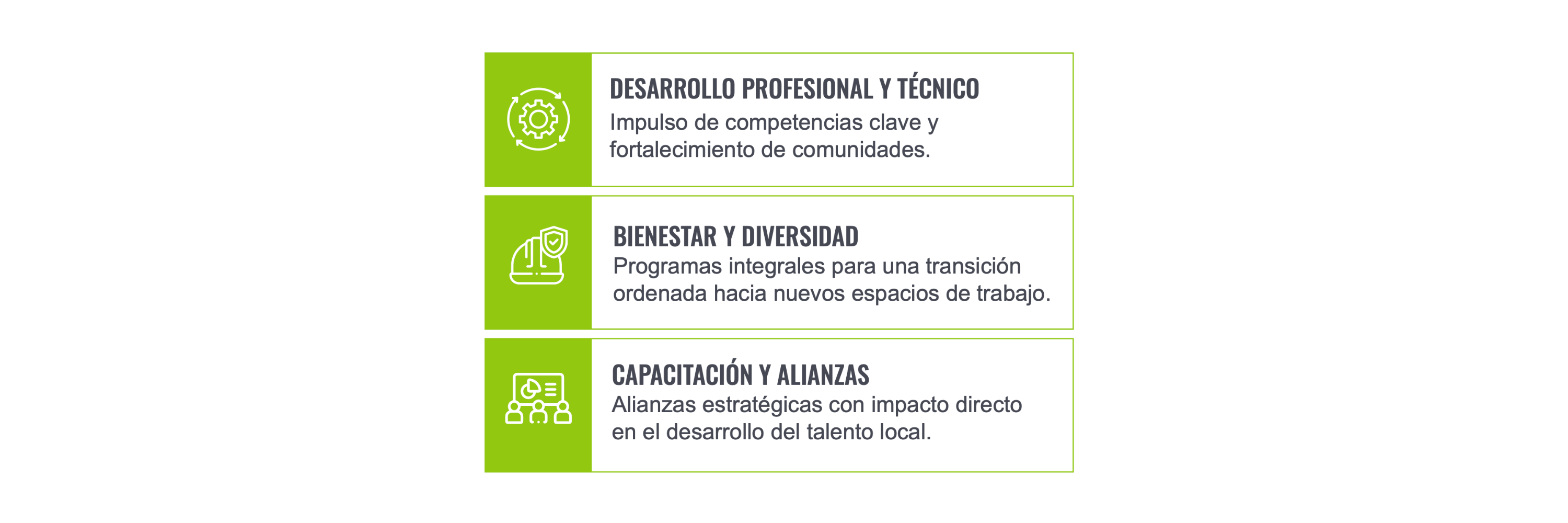 Desde 2021 hemos fortalecido espacios de formación dirigidos a las comunidades cercanas a Loma Larga. Bajo nuestro eje de educación generamos programas de capacitación que otorga certificaciones profesionales enfocados en tres objetivos estratégicos: