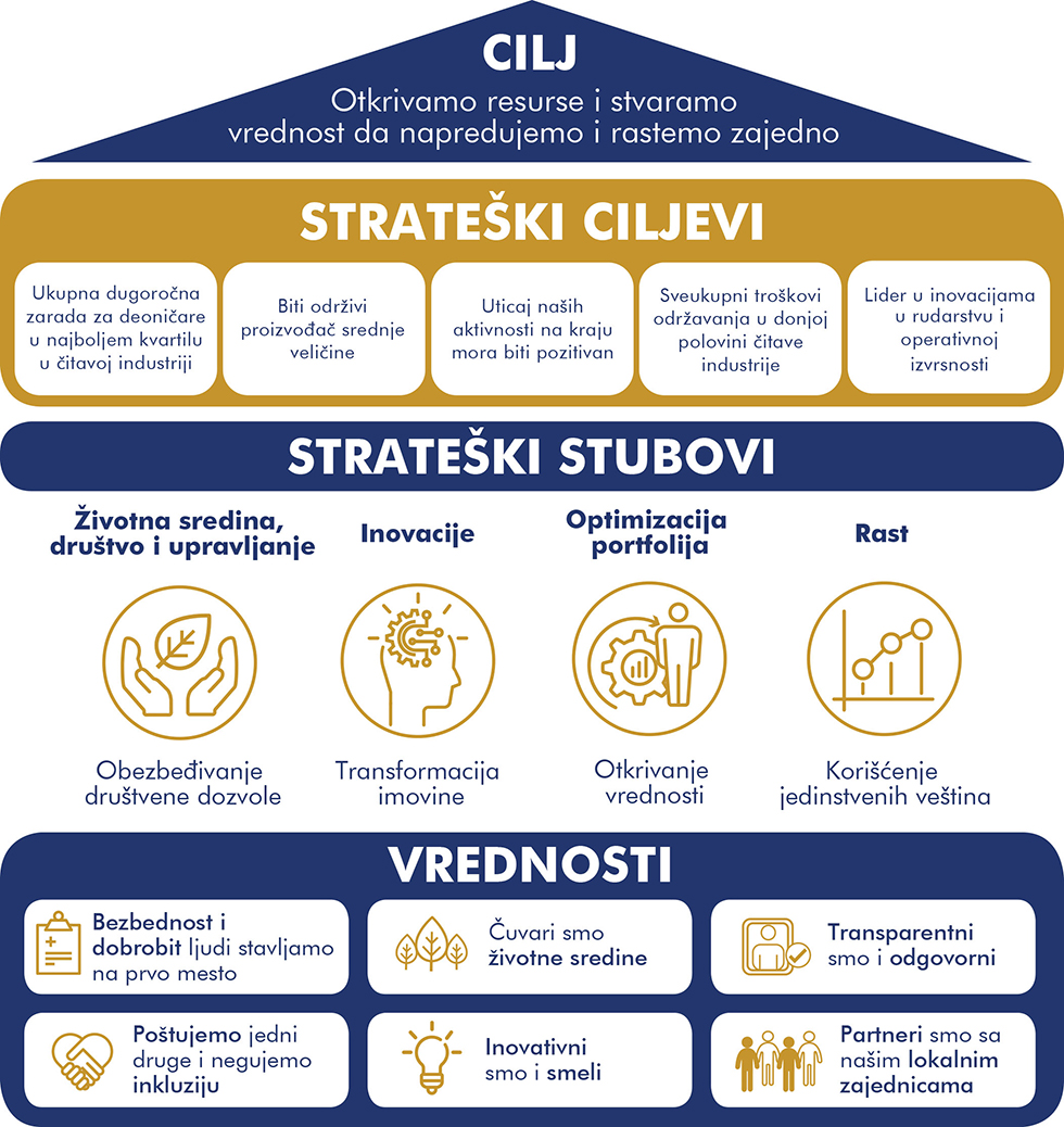 Naš cilj - otkrivamo resurse i stvaramo vrednost da napredujemo i rastemo zajedno – utelotvoruje našu posvećenost zajednicama u kojima poslujemo i našim zainteresovanim stranama koje zavise od nas i predstavlja suštinu onoga što želimo da postignemo svojim kontinuiranim radom u pogledu naših vrednosti i naše strategije.