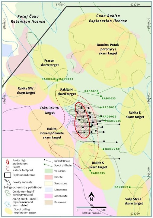 DPM je započeo program agresivnog prospekcionog (skaut) bušenja kako bi testirao kontinuitet skrivene skarnovske mineralizacije u S1 peščarima, kao i dublje lokalizovanih bakar-zlato meta u mermerima na Čoka Rakiti i susednom istražnom prostoru Umka. Prospekciona bušotina RADD040, pozicionirana 600 m severozapadno od Čoka Rakite je presekla sin-mineralizacione diorite kao na Čoka Rakiti i isti stratigrafski paket koji sadrži bogatu mineralizaciju na Čoka Rakiti. Iako u ovoj bušotini nije uočena značajna mineralizacija, prisustvo ciljne geologije i značajne alteracije sugerišu da postoji potencijal za dodatnu bogatu mineralizaciju u smeru ka severu i severozapadu. Izrada kontrolne bušotine RADD041 koja je pozicionirana na istoj platformi, a radi provere pružanja ovih stratigrafskih jedinica prema Čoka Rakiti, trenutno je u toku.