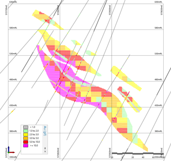 Slika 1. Poprečni presek kroz blok model Čoka Rakite, koji pokazuje blokove obojene prema Au g/t. Linija preseka 4895859mN sa isečenim prozorom od 30 m, gleda na sever.