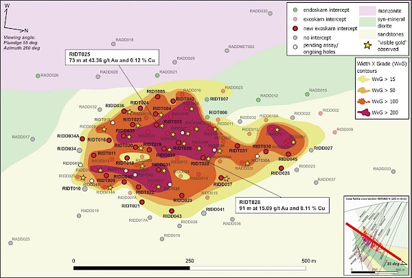 Bogata skarnovska mineralizacija zlata se nalazi u peščarima i konglomeratima bogatim karbonatima, u povlati tela oblika sila a na zapadu se naslanjajući na intruzivno monconitsko telo. Mineralizacija formira pločasto telo blagog pada koje se nalazi između 250 i 450 m ispod površine, dužine 650 m, širine do 350 m i promenljive debljine od manje od 20 m po obodu, do više od 100 m u jezgru mineralizovane zone. Krupnozrno zlato se često uočava u područjima intenzivne retrogradne skarnizacije i uglavnom se nalazi u blizini sin-mineralizacionih diorita, unutar bogatog jezgra ležišta. Trenutna procena mineralnih resursa je izvršena u delu istražnog prostora u kome se nalazi bogata skarnovska mineralizacija.